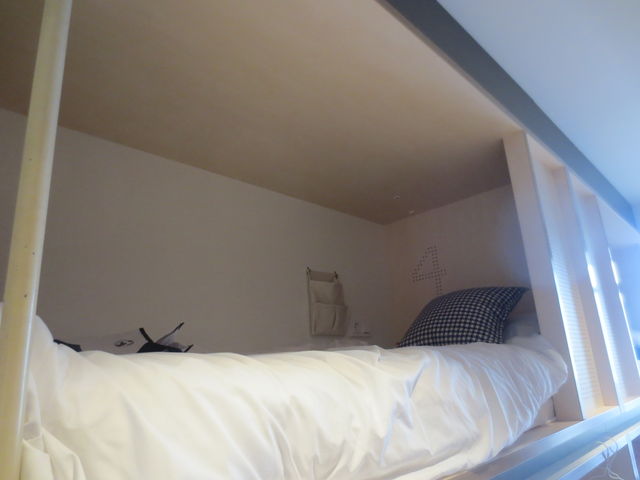 Hostelなので自分でベッドメーキング。コンセントもあり、Free WiFi