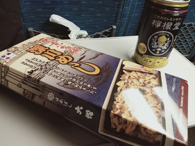 車内でお弁当(深川めし)とチューハイ。カンパーイ!