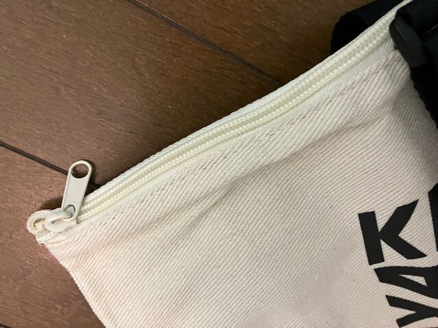前回の綿100%だが薄生地でペラペラだったが、こちらはしっかりして厚みがある。持ち手の部分にアジャスターも付いているので、長く伸ばしてショルダーにもできる。