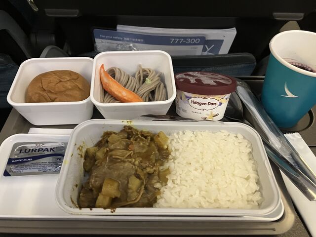 「ルーローハン」といってたけどなんか違う。台鉄の弁当のように彩りが寂しい。帰りも同様にハーゲンダッツのアイスも付いた。