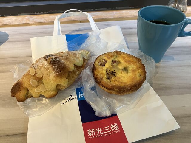昨晩買ったパンを朝食に。キッシュとカスタードクロワッサン。