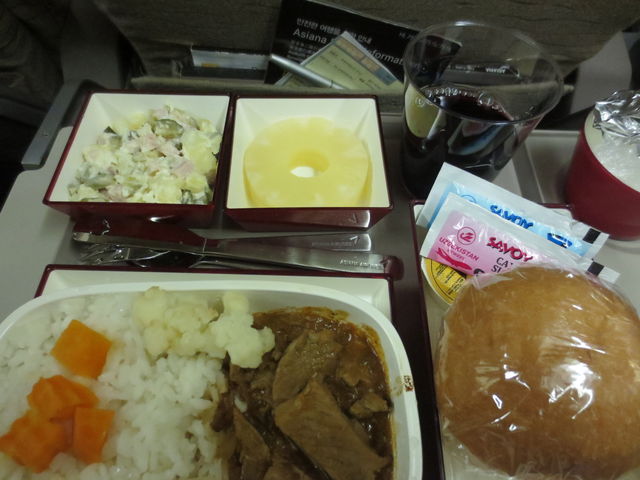 ビーフにした。UAの機内食のような感じ。左上はハムサラダ。