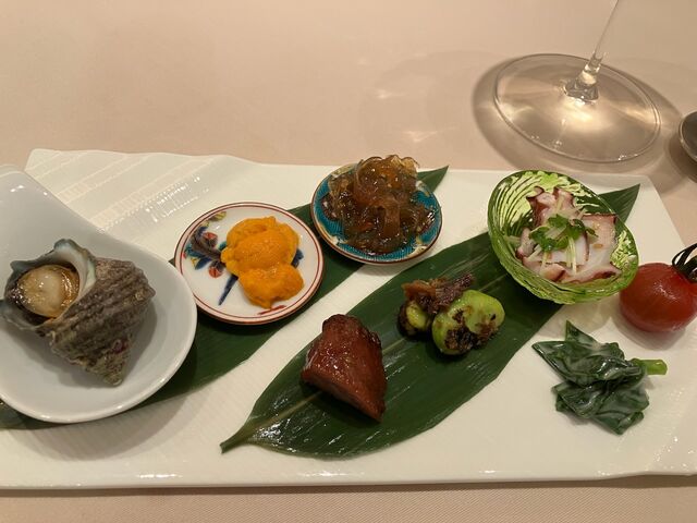 明石のたこ、そら豆、焼き豚、くらげ、ウニ、さざえ